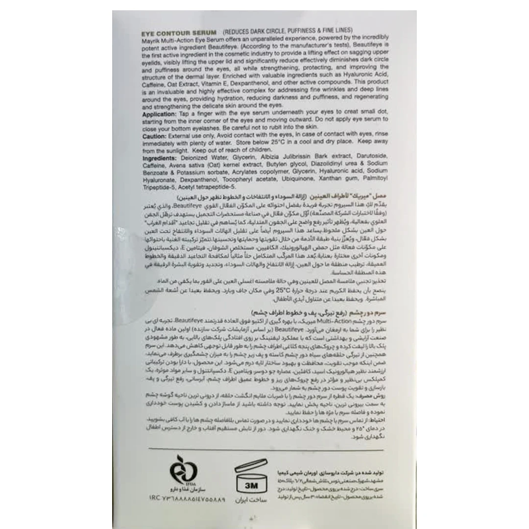 روش مصرفمقدار کمی (یک قطره) از سرم دور چشم مولتی اکشن میریک را با ضربات ملایم انگشت حلقه از گوشه داخلی چشم به سمت بیرونی پخش نمایید. از ماساژ دادن یا کشیدن پوست خودداری کنید و فاصله مناسب با خط مژه را حفظ نمایید. از استفاده روی مژههای پایینی و تماس مستقیم با چشم اجتناب شود.