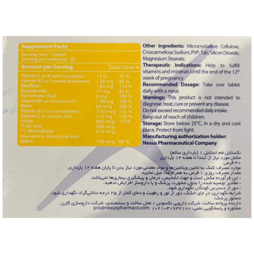هشدار مصرفاین فراورده مکمل است و جهت تشخیص، درمان و پیشگیری از بیماری نیست. مقادیر توصیه شده را بدون مشورت پزشک و یا داروساز افزایش ندهید. در صورت مصرف یا سو مصرف الکل، مشکلات کبدی، مشکلات گوارشی، کمبود ویتامین b۱۲، اختلالات خونریزی و مسمومیت آهن قبل از مصرف با پزشک مشورت کنید. چنانچه به هر یک از اجزای تشکیل دهنده این محصول یا ماهی، سویا و بادام زمینی آلرژی دارید قبل از مصرف، پزشک یا داروساز خود را مطلع نمایید. در افرادی که کمبود آنزیم saccharase isomaltase (عدم جذب گلوکز و گالاکتوز) پرکاری تیروئید دارند، مصرف نشود. توجه داشته باشید که پزشک این محصول را برای شما تجویز کرده است و به این مسئله آگاه است که فواید آن از خطر عوارض جانبی برای شما بیشتر است. بروز عارضه جانبی جدی (واکنش آلرژیک) با این فراورده نادر است. اما در صورت مشاهده هر یک از این علائم با مرکز فوریتهای پزشکی تماس حاصل فرمایید: راش پوستی، خارش، قرمزی و التهاب (به ویژه در صورت، زبان و گلو)، سرگیجههای شدید، اختلال در تنفس، خونریزی و کبودی. آهن موجود در مولتی پریناتال نکستایل ممکن است منجر به تغییر رنگ مدفوغ شده که این اثر مضر نیست. بهتر است در دوران بارداری و شیردهی نیز با نظر پزشک مصرف شود.