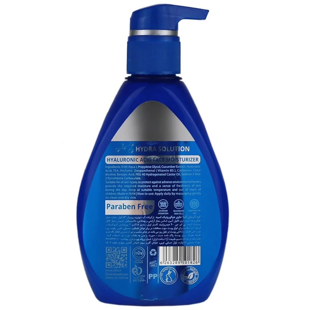 روش مصرفروزانه مقدار مناسبی از کرم آبرسان آدرا حاوی هیالورونیک اسید را روی پوست تمیز و خشک صورت، دست یا بدن قرار داده و با ماساژ ملایم پخش نمایید تا جذب شود. در صورت نیاز، در طول روز تکرار گردد.