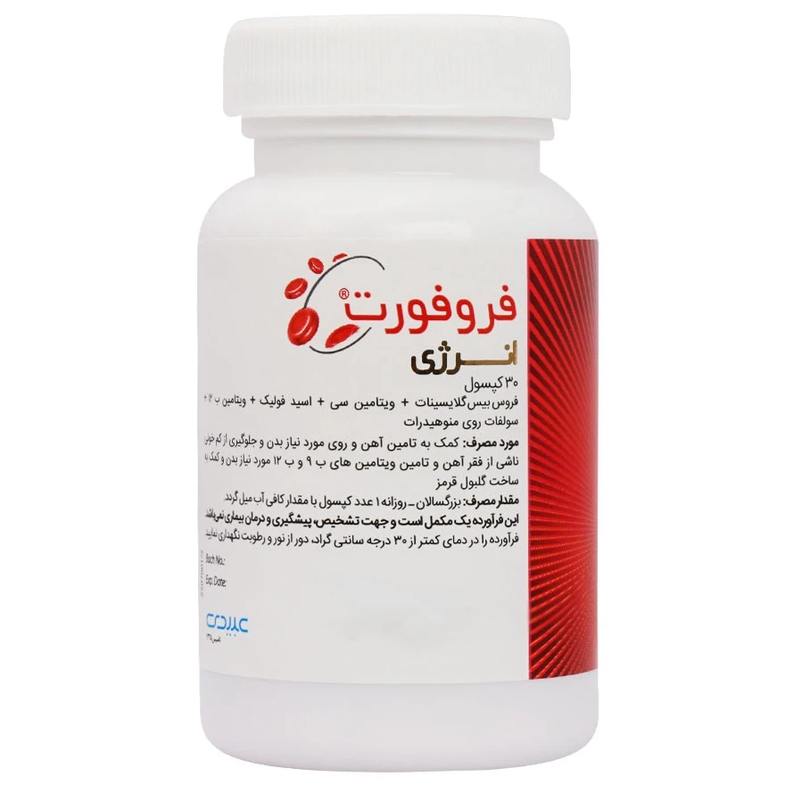 نوع محصولکپسول فروفورت انرژی فروس بیس گلایسینات+ویتامین سی+اسید فولیک+ویتامین ب12+سولفات روی منوهیدرات